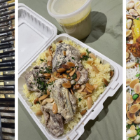 Lamb chunks placed over rice and bread with a side of jameed (dry yogurt) with almonds and pine nuts.